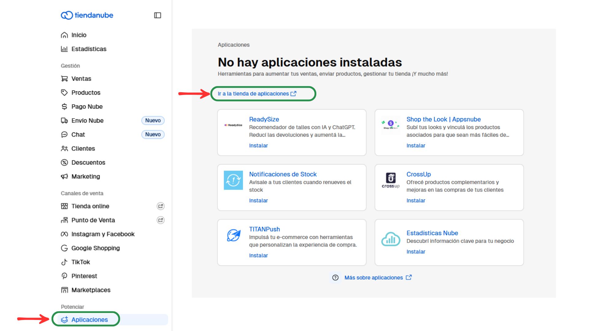 Ingresá a tu cuenta de Tiendanube y andá a “Aplicaciones" > “ir a la tienda de aplicaciones”.