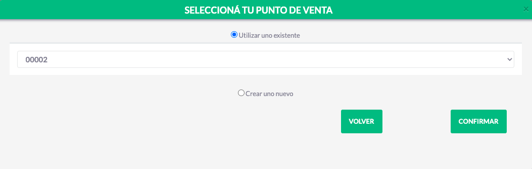 Seleccioná el punto de venta que usarás para emitir comprobantes. Si lo ingresaste en la pantalla anterior, aparecerá ya seleccionado. Si querés ingresar uno nuevo, hacé clic en Crear uno nuevo para registrarlo en Facturante una vez que lo hayas creado en la ARCA.