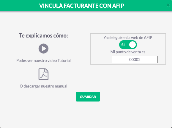 Una vez que finalices ese trámite, tendrás que volver a Facturante y deslizar el botón que aparece en verde en la imagen debajo para informar que ya delegaste el servicio. También necesitarás ingresar el número del punto de venta que creaste en ARCA.