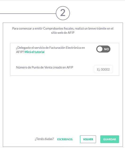 Una vez que completes ese trámite, tendrás que regresar a tu cuenta de Facturante y deslizar el botón que se ve debajo, indicando que ya delegaste el servicio en AFIP. Luego, ingresá el número del Punto de Venta que creaste. Por último, presioná Guardar.