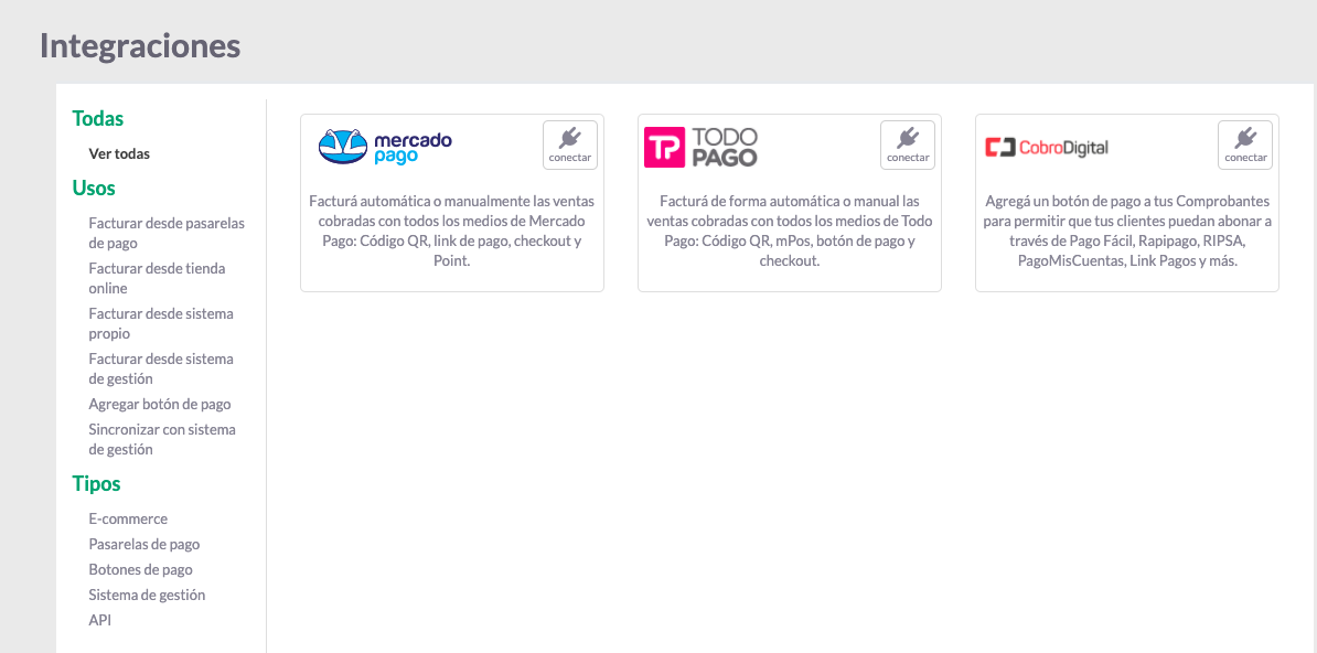 Para finalizar, en la sección Integraciones, podrás conectar tu cuenta con las plataformas disponibles en Facturante para automatizar tu Facturación Electrónica.