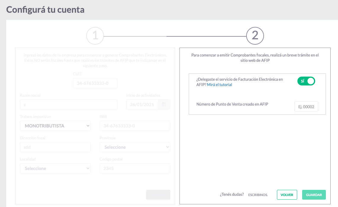 5. Una vez que hayas creado el punto de venta, deberás regresar a Facturante y deslizar el botón confirmando que ya delegaste el servicio de Facturación Electrónica en AFIP.